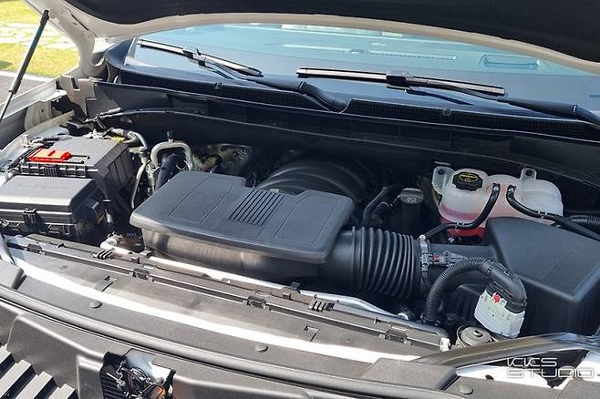 파워트레인은 최고출력 426마력(5,600rpm), 최대토크 63.6㎏·m(1,500~4,000rpm)의 V8 6.2ℓ 가솔린 직분사 엔진을 탑재했습니다. 대배기량 특유의 엔진음과 가속력 덕분에 기분 좋게 속도를 올릴 수 있습니다. 주행 조건에 따라 엔진 실린더 작동 패턴을 달리하는 다이내믹 퓨얼 매니지먼트(Dynamic Fuel Management)를 채택해 연료 효율을 높인 점도 특징입니다. 연비는 복합 5.9㎞/ℓ(도심 5.2㎞/ℓ, 고속 7.1㎞/ℓ)를 인증받았지만, 고속도로 중심의 시승에서는 9㎞/ℓ 이상의 실 연비를 기록했습니다. 효율성을 위해 타는 차는 아니지만, 3t에 가까운 무게와 큰 엔진을 감안하면 나름 매력적인 수치입니다.