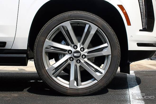 측면에서는 제품 역사상 가장 큰 24인치 알로이 휠이 시선을 사로잡습니다. 알루미늄 커팅 같은 화려함 대신 평범한 원톤 휠이지만, 휠의 직경과 펜더와의 간격만으로도 압도적인 분위기를 연출합니다. 에스컬레이드는 일반형과 휠베이스를 늘린 ESV 두 가지 모델로 나뉩니다. 시승차는 ESV 모델로, 길이 5,790㎜, 휠베이스 3,407㎜의 거대한 차체를 자랑합니다. 뒷문의 파팅라인 위치로 일반형과 ESV를 구분할 수 있습니다. ESV는 파팅라인이 로커패널까지 내려오고 C필러에 캐딜락 크롬 엠블럼이 부착되어 있습니다. 압도적인 크기 덕분에 SUV라기보다는 소형 버스 같은 인상을 줍니다.