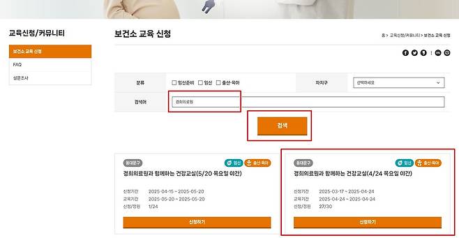 홈페이지 접속 후 상단의 '교육신청/커뮤니티' 메뉴로 접속한 다음, 검색어에 '경희의료원'을 검색하면 보다 빠르게 신청이 가능하다. 회원가입 후 로그인을 해야 신청할 수 있으므로, 사전에 미리 회원가입부터 진행해놓는 것이 좋다.