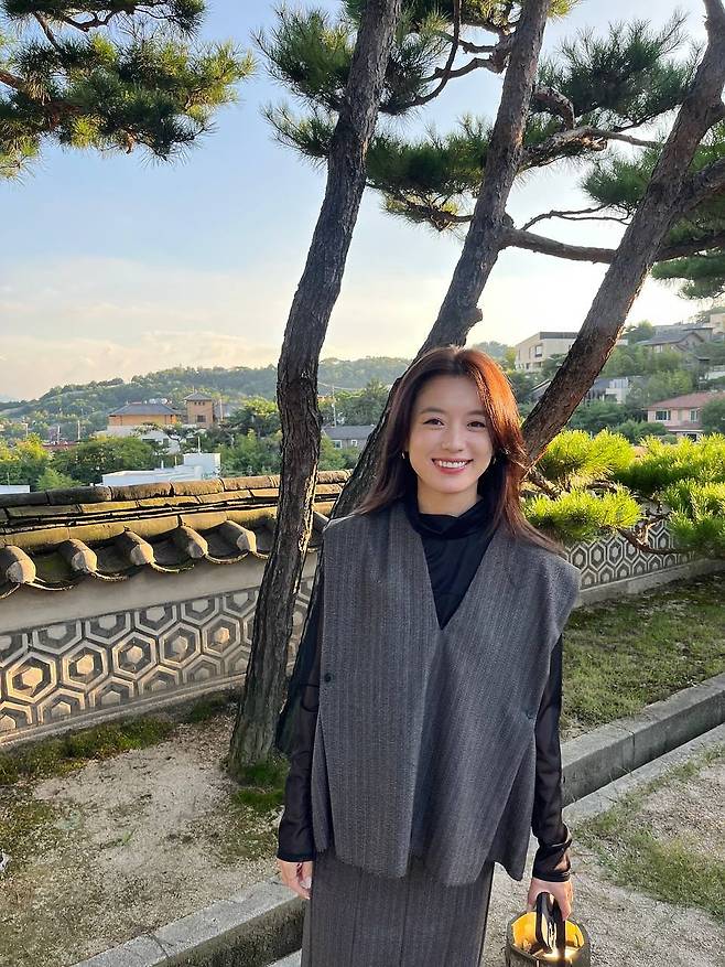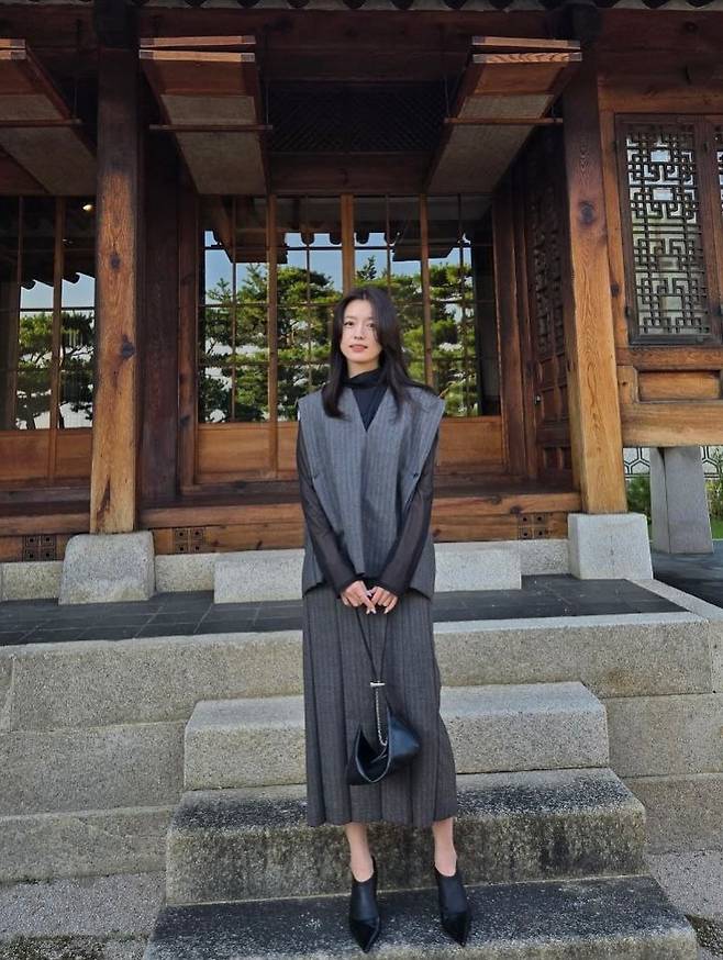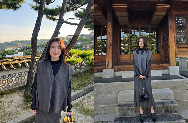 전통 한옥의 서까래와 처마 곡선 아래, 그녀가 입은 모던한 그레이 룩은 이질적인 충돌이 아닌, 완벽한 조화를 이루며 한 폭의 그림 같은 장면을 완성했습니다.