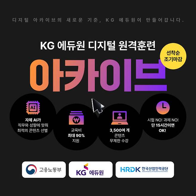 한편 디지털 원격훈련 아카이브 사업은 정부 지원을 통해 기업의 교육비 부담을 완화할 수 있어 매년 조기 마감되는 특징이 있다. 참여를 희망하는 기업은 KG에듀원 기업교육 홈페이지를 통해 신청할 수 있다.