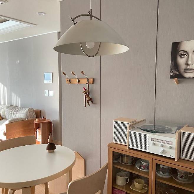가족이 저희 둘과 냥이 한 마리뿐이라 식탁도 티테이블 사이즈의 작은 원형 테이블을 두고옆쪽으로 좋아하는 빈티지 잔을 모아두는 그릇장, 그 위로는 턴테이블을 두었어요.