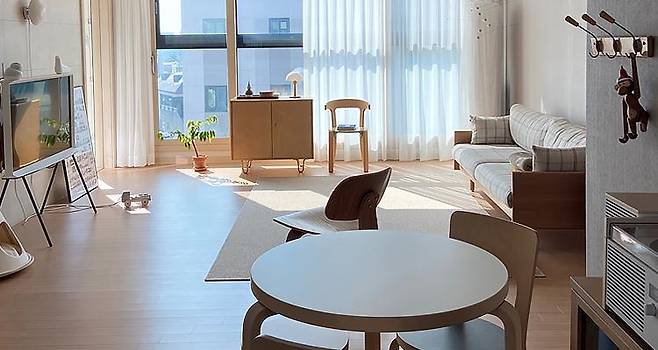 우드톤을 좋아해서 전체적으로 우드 색상의 가구들이 많고 포근하고 정돈된 느낌으로 꾸몄어요. 그리고 이사 오면서 바꾸고 싶었던 유일한 가전제품은 이 삼성 Serif TV였어요.