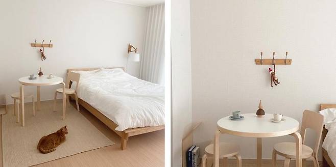 침대 옆에는 포근한 느낌의 쿠바체어를 두고 옆에 아르텍 매거진랙을 눕혀 협탁처럼 사용하고 있어요.