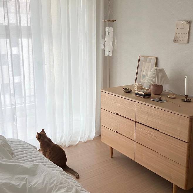 침대 아래쪽 서랍장은 신혼 때 산 제품인데 아직도 잘 사용하고 있어요. 무난한 디자인이라서 어느 가구와 매치를 하기에도 좋은 것 같아요.