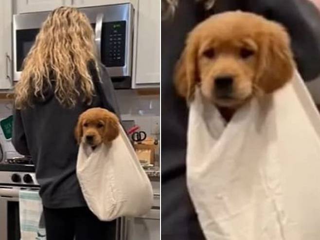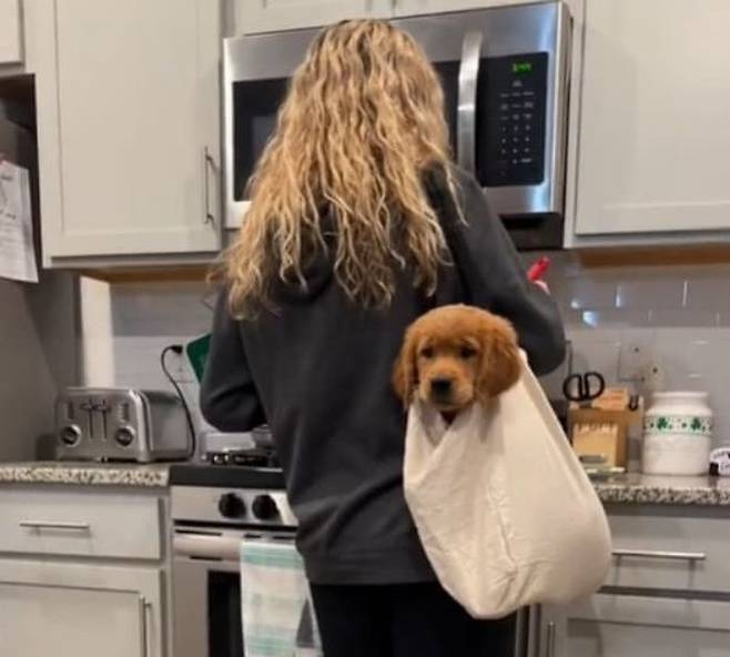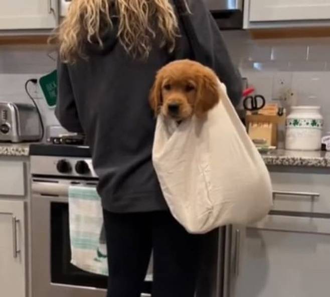 사연은 이렇습니다. SNS상에는 부엌에서 일하는데 소란 피우고 방해하는 강아지를 에코백에 태운 집사 모습이 담긴 영상이 올라왔죠.