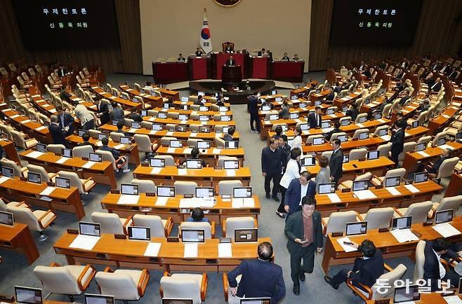 | 野 필리버스터 시작하자 與의원들 퇴장 국민의힘 신동욱 의원이 4일 오후 열린 국회 본회의에서 방송법 개정안 처리에 반대하는 무제한 토론(필리버스터)을 진행하고 있다. 신 의원이 필리버스터를 시작하자 더불어민주당의 상당수 의원들이 본회의장을 나가고 있다. 장승윤 기자 tomato99@donga.com |