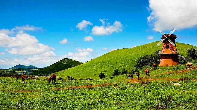 여름의 새별오름은 파란 하늘과 맞닿은 거대한 초록 융단처럼 펼쳐진다. 가을의 억새가 주는 서정적인 매력과 달리, 이 계절에는 짙은 녹색이 주는 에너지가 여행자의 발걸음을 가볍게 한다.