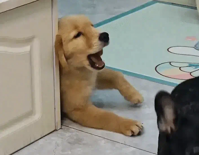 그런데 예상치 못한 해프닝이 벌어졌습니다. 너무 조급하게 움직인 프렌치 불도그가 실수로 골든 리트리버의 앞발을 밟고 말았습니다! 골든 리트리버는 마치 전기 충격을 받은 듯 즉시 앞발을 번쩍 들어 올리며, 마치 세상이 무너지는 것처럼 귀를 찢을 듯한 비명을 질렀습니다. 누가 보면 마치 엄청난 고통을 겪는 것처럼 과장된 반응을 보였습니다.
