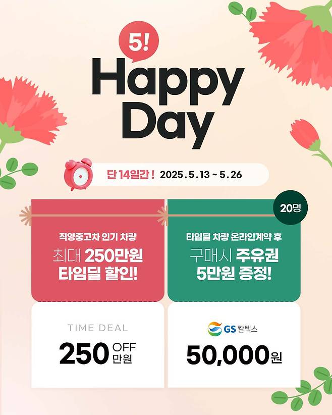 이번 타임딜은 가족 나들이와 레저 활동이 활발해지는 5월을 맞아, 다양한 라이프스타일에 맞는 중고차를 합리적인 조건에 제공하기 위해 마련됐다. 타임딜 대상 차량은 ▲현대 아반떼 등 엔트리카부터, ▲제네시스 G90 ▲현대 그랜저 등 부모님 세대가 선호하는 중대형 세단, ▲제네시스 GV80 ▲현대 신형 싼타페 등 장거리 이동이나 가족 나들이에 적합한 SUV까지 폭넓게 구성되어 있다. 특히, 패밀리카로 수요가 높은 현대 '팰리세이드'는 최대 250만 원의 할인 혜택이 적용되며, 타임딜 차량 구매 고객 선착순 20명에게는 GS칼텍스 주유권(5만원)이 추가 증정된다.