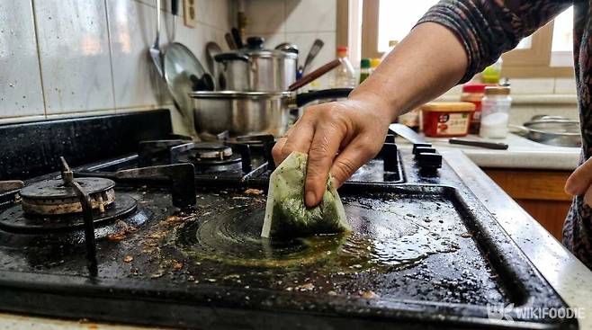가스레인지 주변 타일에 튄 기름은 마른 행주로 닦으면 오히려 더 퍼진다. 이때 물기가 남아 있는 녹차 티백을 손에 쥐고 기름이 튄 자리를 문질러보면 기름기가 밀려나오는 게 눈에 보일 정도다. 녹차 속 사포닌이 물과 기름 양쪽 모두와 결합하는 성질을 가진 천연 계면활성제 역할을 하기 때문이다. 세제를 쓰지 않아도 되고, 주방용 화학 세제가 손에 닿는 것이 꺼려질 때 특히 쓸 만하다. 눌어붙은 자리라면 티백으로 먼저 문지른 뒤 2~3분 뒤에 닦아내면 더 잘 지워진다.