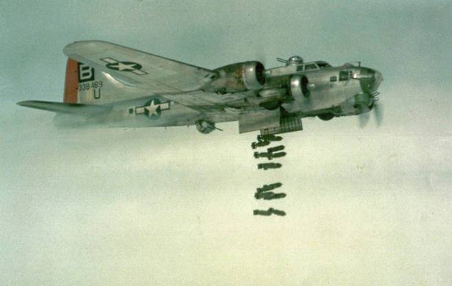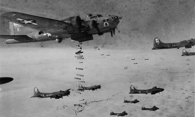 제2차 세계대전 당시 연합군의 B-17 플라잉 포트리스 폭격기들은 유럽 상공에서 독일 주요 목표를 향해 대규모 폭격 임무를 수행했습니다.