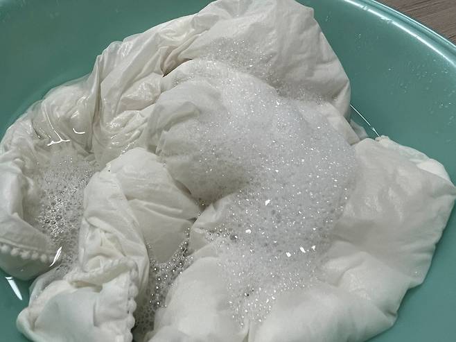 거품이 나도록 손으로 주물러 베개를 가볍게 빤 다음 20분 정도 둡니다. 이렇게 하면 때가 충분히 불고, 기름 성분 등이 빠져나옵니다.