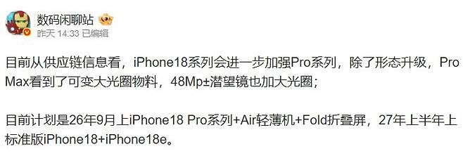 Digital Chat Station은 이러한 두 가지 업그레이드가 프로 맥스 모델에 우선 적용될 가능성도 있다고 덧붙였습니다. 즉, 아이폰 18 프로 맥스가 카메라 기능 면에서 한 단계 더 차별화될 수 있다는 이야기입니다.