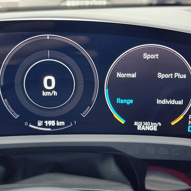 갑자기 궁금해졌다. 각각의 드라이브 모드에 따라 어느 정도 차이가 있을지. 먼저 레인지(RANGE) 모드 기준으로 195km를 더 달릴 수 있다고 보여준다. 레인지모드는 가능하면 주행거리를 늘리기 위해 동승석 디스플레이까지도 강제로 끄는 등 최대한의 노려을 한다.