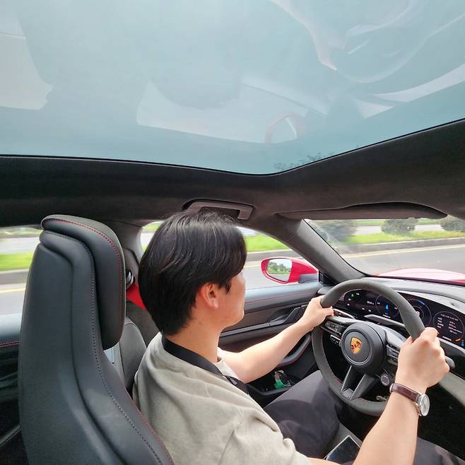 오픈 톱이 아니더라도 포르쉐 타이칸 GTS는 충분히 높고 푸르른 하늘을 제대로 즐길 수 있는 스포츠카다. 하늘을 가리는 파노라마 루프는 방해가 되지 않는다.