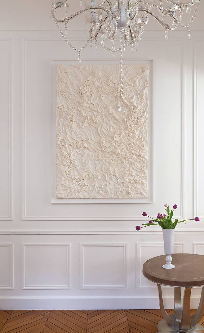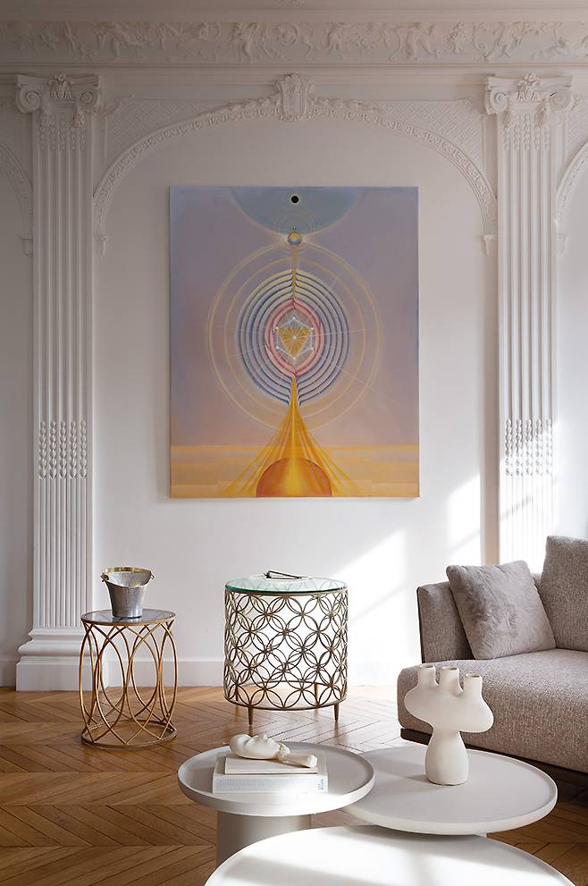 대화를 나누고 있는 오후, 거실 한쪽 벽을 채운 아이가나 갈리의 작품 아래로 창을 통해 쏟아진 햇빛이 아른거립니다. 카자흐스탄 출신으로 런던에서 활동하고 있는 작가가 자라난 초원의 영적인 에너지와 본질적으로 연결된 추상적 이미지가 파리의 전형적인 몰딩 장식과 부딪히고 공명하고 있었죠. 자신이 시간을 보내는 공간을 어떤 예술로 채우느냐가 수집가의 취향을 대변하는데요. 갈수록 혼돈스럽고 위기감이 높아지는 시대상 속에서 잠시라도 마음의 풍요를 채울 수 있는 긍정적인 에너지를 지닌 작품들을 좋아한다고 했어요.