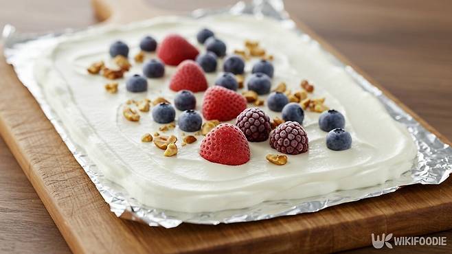 이후 블루베리나 견과류 등 본인의 취향에 맞는 다양한 재료들을 얹어주고 냉동실에 3~4시간 얼려준다. 다 얼었다면 먹기 좋은 크기로 썰어 먹어주면 된다.