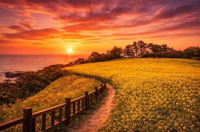 특히 해 질 무렵이 되면 풍경은 완전히 달라집니다. 노란 꽃 위로 붉은 빛이 내려앉고, 바다는 그 색을 그대로 받아들입니다. 그 순간은 사진보다 눈으로 담아야 더 오래 남는 장면이에요.