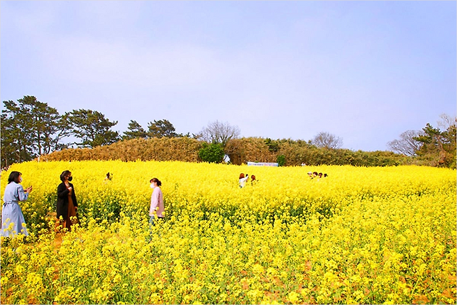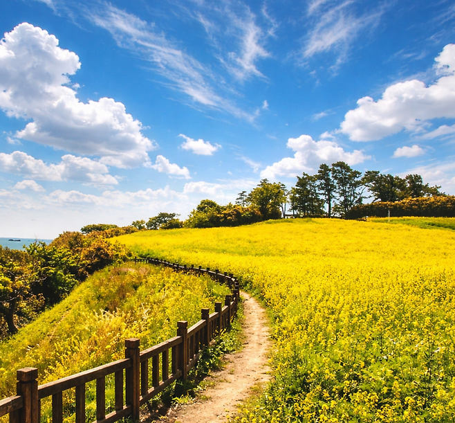 해안선을 따라 걷다 보면 어느 순간 시야가 확 열립니다. 그 끝에 펼쳐지는 건 3만 2천㎡, 약 9,680평 규모의 유채꽃밭이에요. 단순히 넓다는 표현으로는 부족할 만큼, 눈앞이 온통 노란 물결로 가득 차 있습니다.