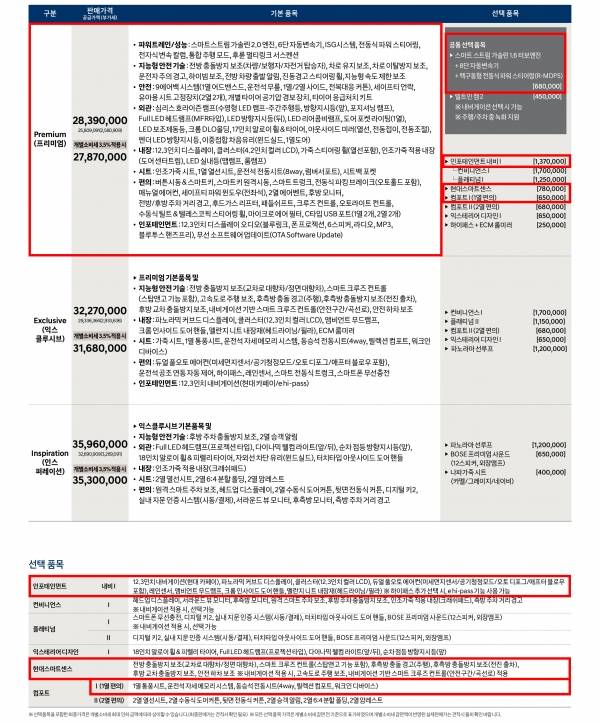 기본인 프리미엄 트림은 필수적인 편의 기능과 출고 이후 장착하기 힘든 첨단 편의 장비가 일부 빠져있다. 대표적인 예로 풀 오토 에어컨이다. 프리미엄 트림에서 풀 오토 에어컨을 선택하기 위해서는 137만 원을 추가해 ‘인포테인먼트 내비 1’ 옵션을 선택해야 한다.
