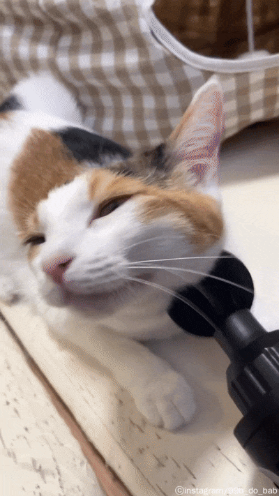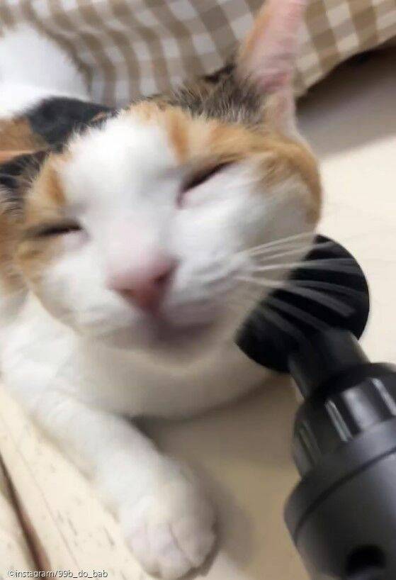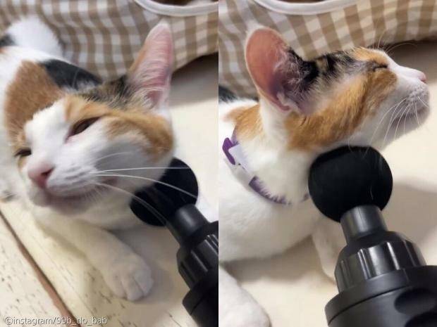 영상에는 삼색이 고양이 비비가 마사지건 앞에 얼굴을 대고 있는 모습이 보이는데.