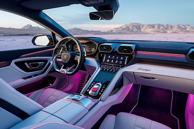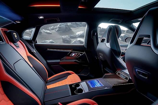 실내 예상도도 함께 공개됐다. 1열 공간을 먼저 살펴보면, 기존의 슈퍼카 대비 시트 포지션이 높게 잡힌 듯한 모습이다. 람보르기니 특유의 육각형 디자인이 스티어링 휠 혼 커버, 에어컨 송풍구 등 곳곳에서 확인된다. 센터 콘솔은 암레스트는 양문형으로 보이며, 센터 디스플레이는 상하 분할 배치됐다.