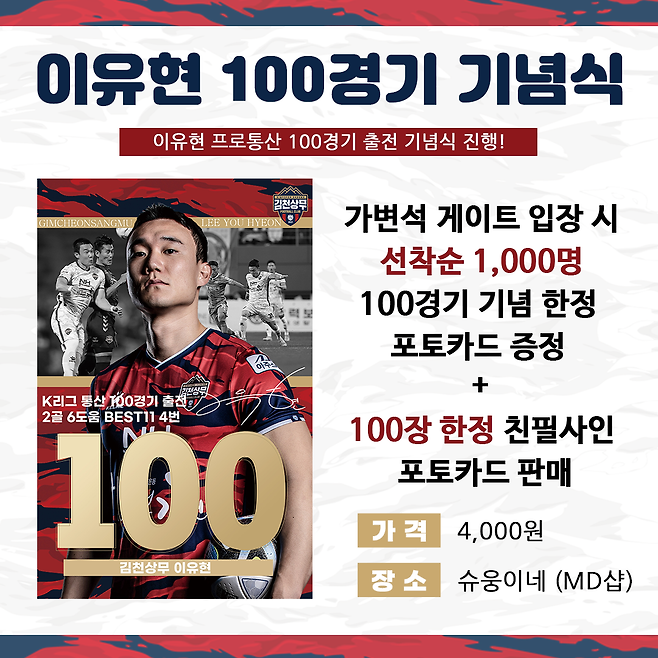 경기 시작 전에는 지난해 10월 29일 대전하나시티즌 전에서 프로통산 100경기 출전을 달성한 이유현의 기념 시상식이 예정돼있다. 관련해 가변석 출입구에서 선착순 1,000명에게 이유현 포토카드를 증정할 예정이다. 슈웅이네(MD샵)에서는 이유현 친필사인 포토카드 100장을 한정 판매한다.