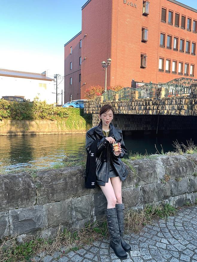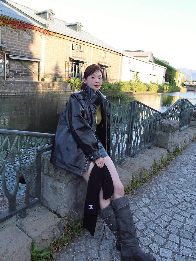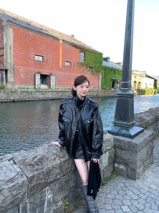 살짝 오버핏의 블랙 레더 재킷에 미니 스커트, 그리고 롱부츠까지
