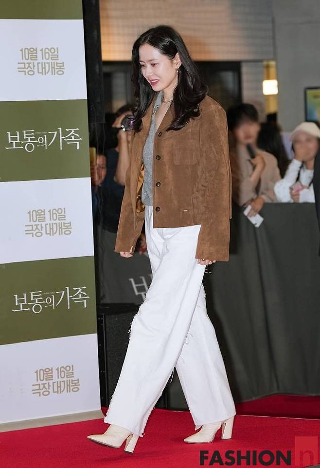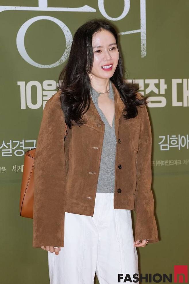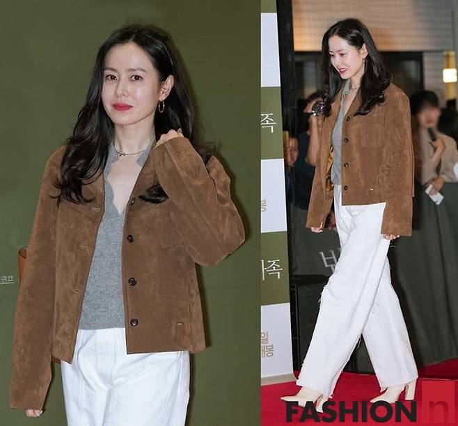 이날 손예진은 스웨이드 재킷과 화이트 팬츠를 매치한 면서도 스타일리시한 가을룩으로 눈길을 사로잡았다.