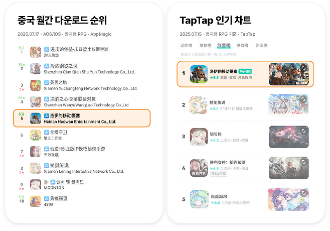 AppMagic 등 앱 데이터 서비스 기준 '포트리스 사가'는 7월 기준 iOS RPG 부문 월간 다운로드 9위, iOS 및 AOS 합산 방치형 RPG 부문 월간 다운로드 5위에 올랐다. 특히 중국 대표 게임 플랫폼 TapTap의 방치형 RPG 인기 차트에서는 정식 출시 직후 1위를 차지했다. TapTap 유저 평점도 안정적으로 높은 수준을 유지 중이다.