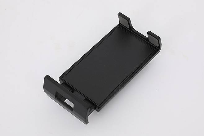 모락 스윙 자바라 탁상용 침대 거치대의 홀더는 검은색 플라스틱으로 되어있으며, 최소 135mm부터 최대 197mm까지의 스마트기기를 거치할 수 있다.