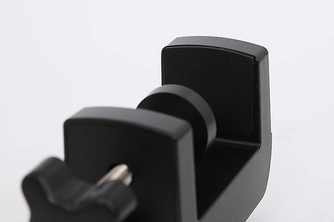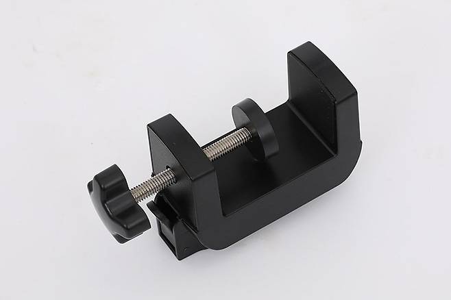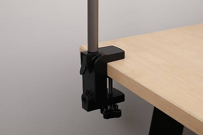 책상에 클램프를 고정하는 방법은 고정나사를 풀어서 가운데 공간을 넓힌 뒤 책상에 클램프를 끼워 넣고 고정나사를 다시 조이면 된다. 클램프를 고정하고 지지대를 장착하면 다음과 같은 형태가 된다.