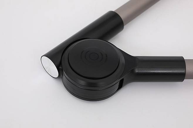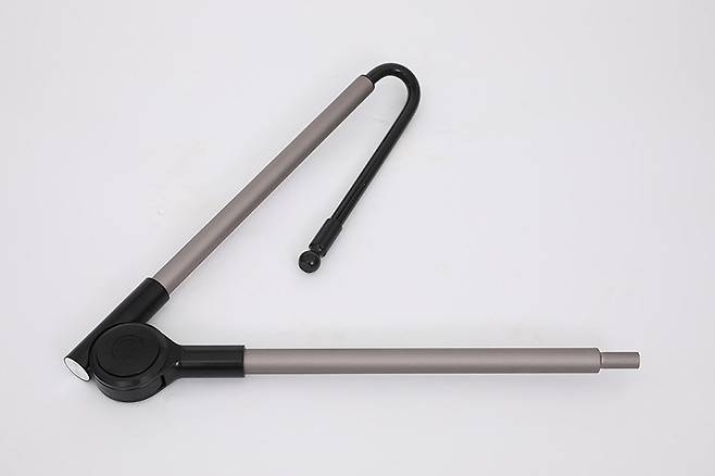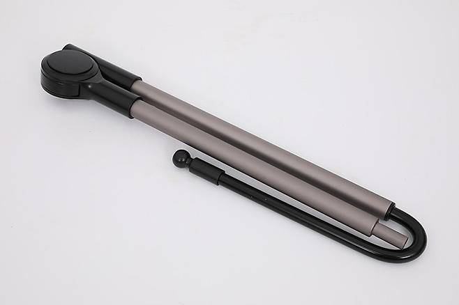 접이식 지지대의 상단 바는 아래로 처지지 않도록 잠금 기능이 자동으로 적용되는데, 각도를 아래로 조절하고 싶을 때에는 연결 부분에 있는 원형의 언락 버튼을 누르면서 조절해야 한다.