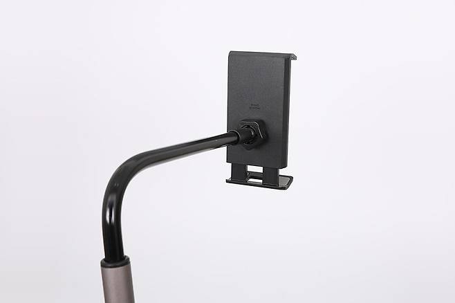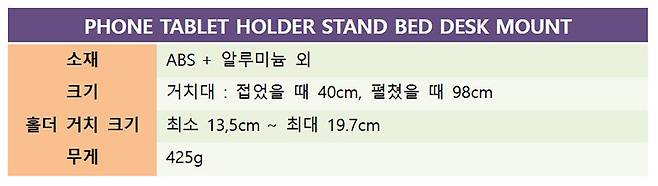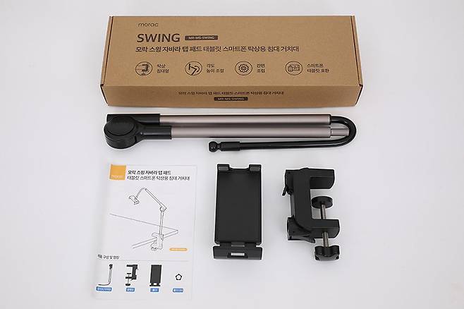 박스 안에 담긴 구성품은 접이식 거치대와 책상에 고정하기 위한 클램프, 스마트 기기를 거치하기 위한 홀더, 그리고 사용 설명서가 제공된다.