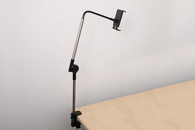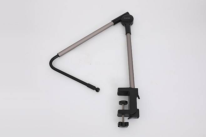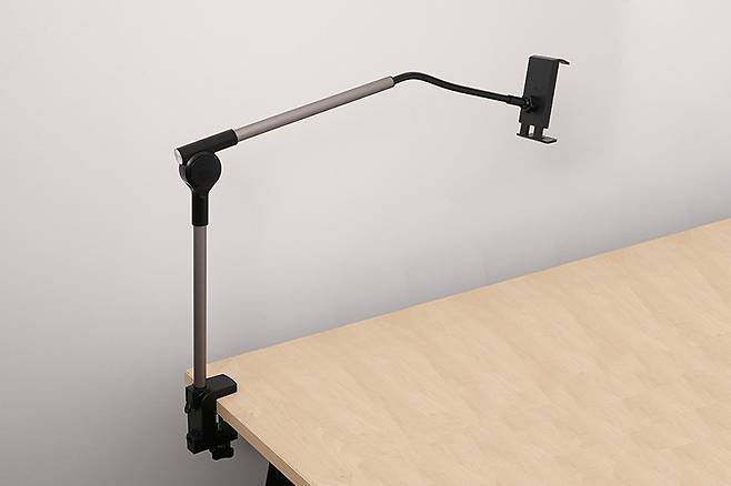 다음은 클램프와 지지대, 홀더까지 모두 조립하고 책상에 설치한 모습이다. 두 개의 금속 바와 와이어를 이용해 다양한 각도로 조절할 수 있다.