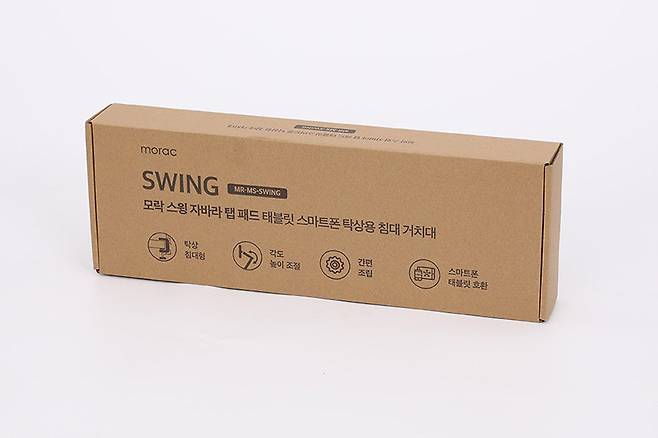 모락 스윙 자바라 탁상용 침대 거치대는 갈색 골판지 박스에 담겨있다. 박스에는 제품의 모델명과 특징만 적혀있고 외형 이미지는 함께 인쇄되어 있지 않기 때문에 박스 패키지만으로 제품의 디자인을 가늠하기는 불가능하다.