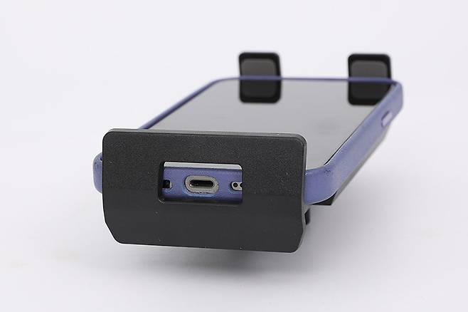 홀더의 아래쪽 그립 부분에는 가운데 부분에 구멍을 두어서 홀더에 장착한 상태로 충전 케이블을 연결해 사용하면서도 충전하는데 불편이 없도록 했다.