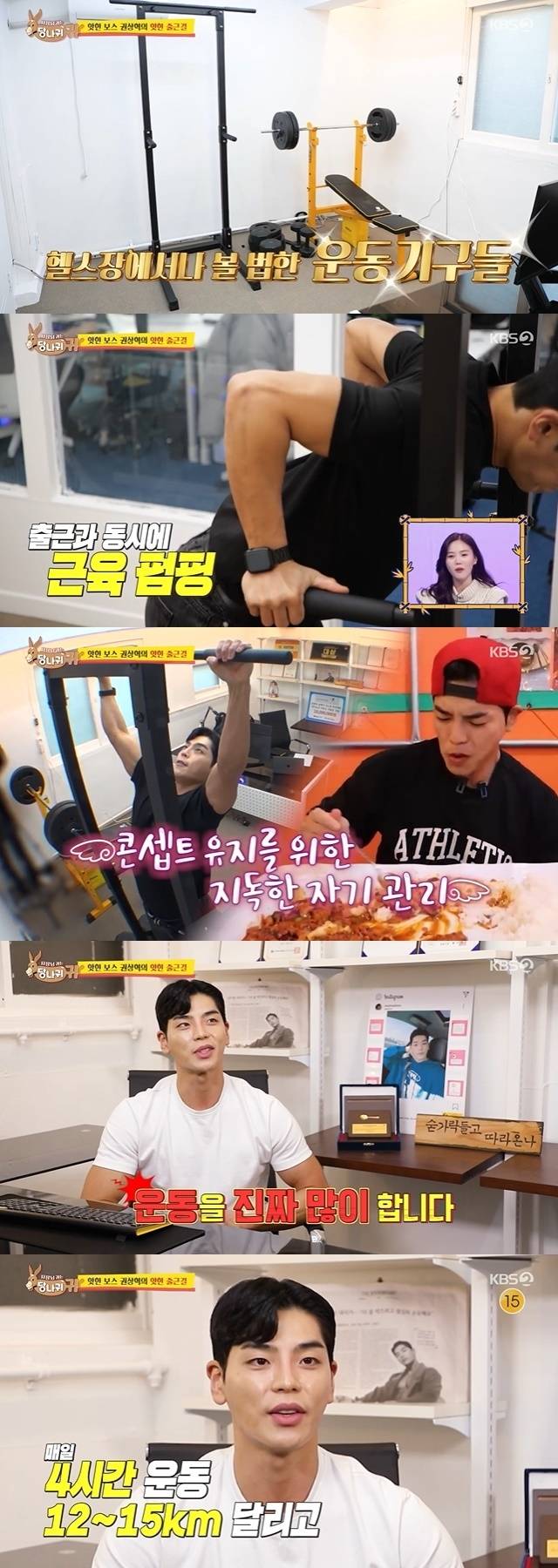 권상혁은 "저는 체중이나 몸매 관리를 위해서 운동을 진짜 많이 한다. 하루 12, 15㎞를 뛰고 4시간 운동을 한다"고 밝혔다. 직원은 권상혁이 "특히 운동에 대해선 강박이 심하시다"고 증언했다. (사진=KBS 2TV '사장님 귀는 당나귀 귀' 캡처)