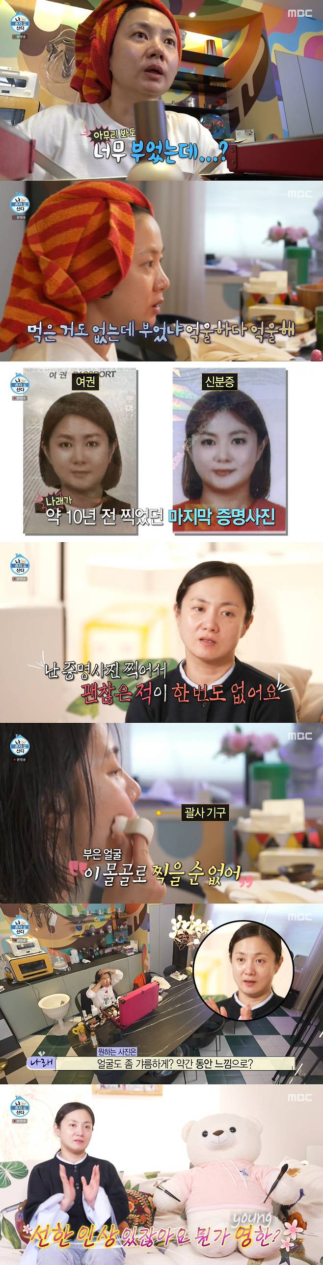 먼저 괄사 기구로 부기를 제거하던 박나래는 "얼굴도 좀 갸름하게 동안 느낌으로 선한 인상이 있지 않나. 이제는 젊음과 거리가 멀어지고 있다"며 "그때는 세미 스모키가 유행했다. 눈썹도 갈매기에다가 너무 세보인다. 여권 사진은 너무 노숙하게 나왔다"고 했다. 이어 그는 "증명 사진이 하나도 선한 게 없다. 선한 느낌으로 하고 싶다"고 했다.