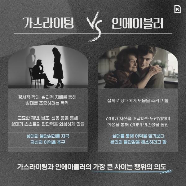가스라이팅과 인에이블러의 행동은 비슷해 보이지만 의도에서 차이가 난다. 가스라이팅은 상대를 자신의 입맛대로 조종하려는 명백한 의도가 있다. 반면 인에이블러는 조종하려는 의도가 없다. 관계에서 자존감을 얻기 위해 헌신적으로 수용할 뿐이지만 스스로도 그 의도를 깨닫지 못한다. 심리 전문가인 앤절린 밀러는 저서 <나는 내가 좋은 엄마인 줄 알았습니다>에서 “나는 누군가가 나를 필요로 하기를 바랐다. 내 자존감은 거기에 달려 있었다”라고 서술했지만, 저자 역시 본인이 인에이블러라는 사실을 깨닫기까지 오랜 시간이 걸렸다고 말한다.