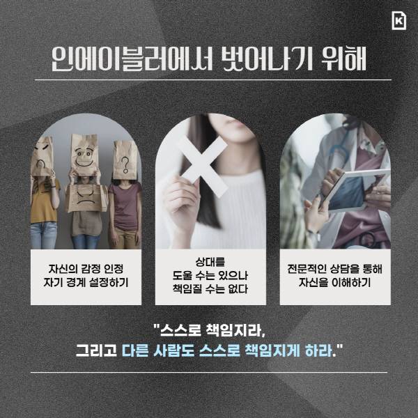 더 이상 인에이블러로 살고 싶지 않다면 가장 먼저 자신의 경계를 설정해야 한다. 타인의 감정이 아니라 자기 감정과 필요를 인정하고, 상대방의 문제에 너무 깊이 개입하지 않아야 한다. 상대방을 도울 수는 있지만 그 문제에 관해 온전히 책임질 수 있는 건 상대방뿐이라는 것을 인정해야 한다. 앤절린 밀러는 “불행히도 나는 ‘스스로 책임지라’는 부분에만 초점을 맞춘 나머지 당연한 귀결인 ‘다른 사람들도 스스로 책임지게 하라’는 부분을 놓쳐버렸다”라며 자신의 몫만큼만 책임지는 것이 관계에서 가장 중요하다고 강조했다.