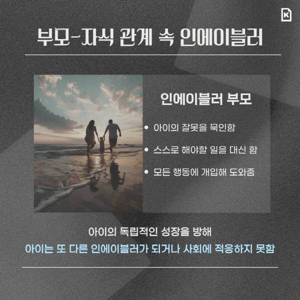 ‘내가 인에이블러일까?’라는 고민을 해봐야 할 관계는 친밀한 관계, 그중에서도 특히 부모-자식 관계다. 인에이블러 부모는 헌신적으로 비칠 수 있으나 오히려 아이가 성장 과정에서 마땅히 경험해야 할 기회를 빼앗고, 독립적인 개체로 성장하는 것을 방해한다. 인에이블러 부모의 곁에서 성장한 아이는 ‘사랑받기 위해서는 저렇게 행동해야 한다’고 생각하며 또 다른 인에이블러가 되거나, 자기 행동에 책임지지 못해 사회를 겉돌 가능성이 크다. 부모와 자녀 모두에게 잘못된 결말을 안겨주는 것이다.