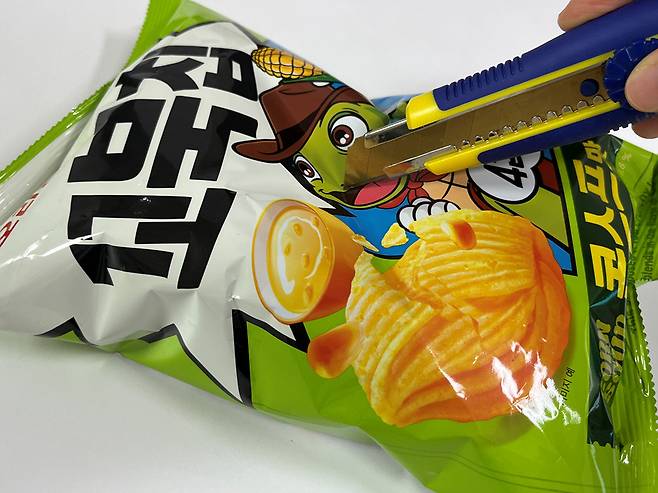 이 방법은 특이하게 과자 봉지 정 중앙을 뜯는 방법입니다. 칼이나 가위로 봉지 중앙에 작은 구멍을 내주세요.