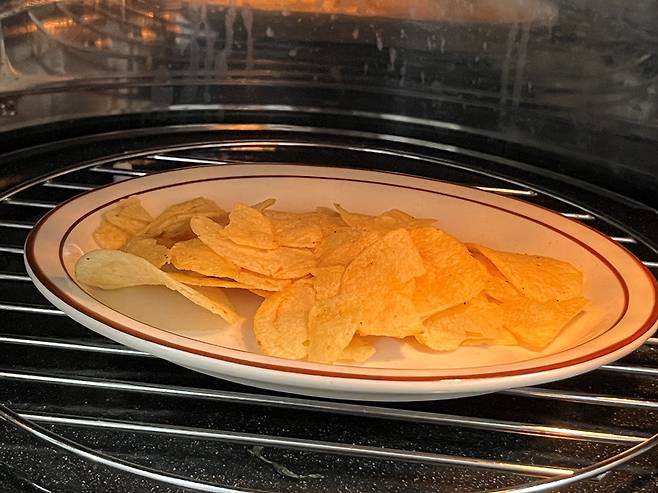 이럴 때는 접시에 과자를 담고 전자레인지에 살짝만 돌리세요. 30초 먼저 돌려보고 과자 상태 확인 뒤 바삭함이 부족하면 10초, 20초씩 늘려가며 돌려 보세요.