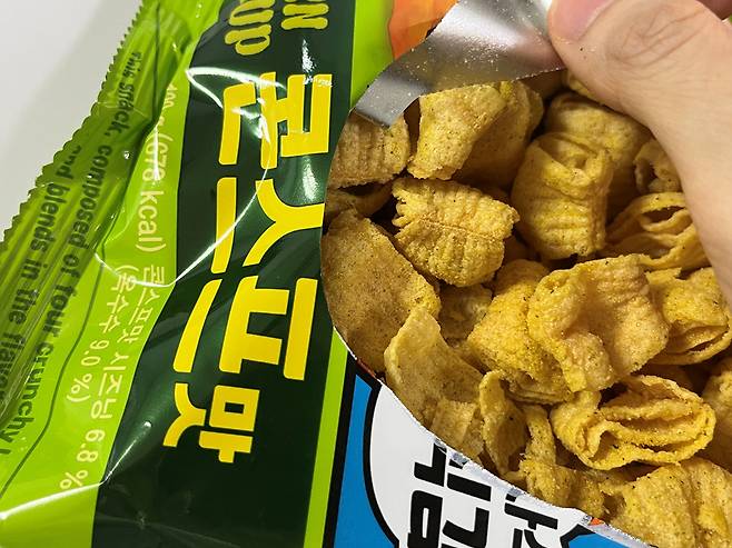 이렇게 하면 과자 봉지에 손을 깊숙이 안 넣어도 됩니다. 바로 집어 먹을 수 있으니 과자 가루도 안 묻고 편하더라고요.