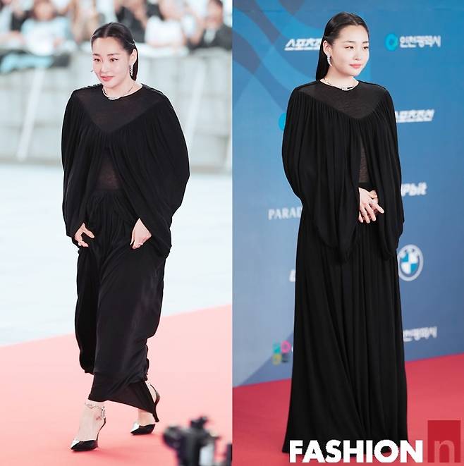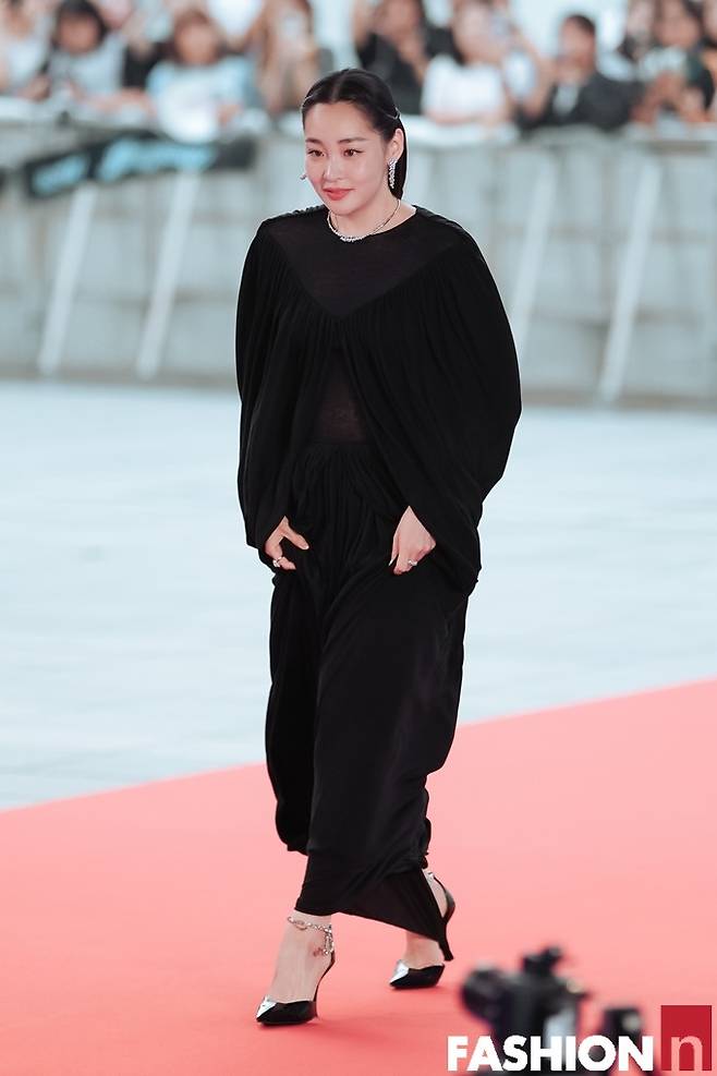 이날 김민하는 깊은 블랙 컬러의 드레이핑 디테일이 가미된 루즈한 톱과 롱스커트의 드레스룩으로 시크하면서도 미니멀한 실루엣의 절제된 우아미를 과시했다.
