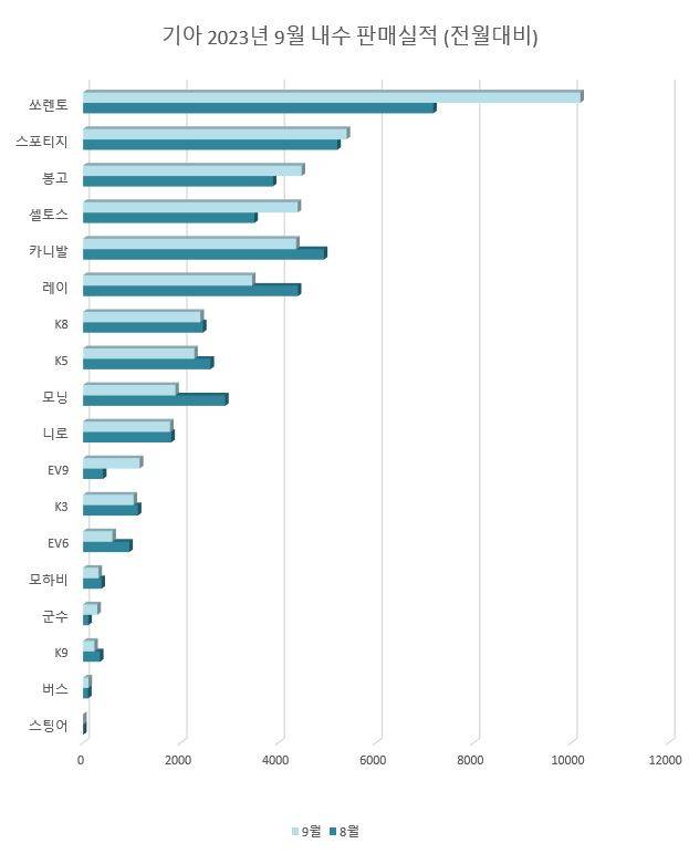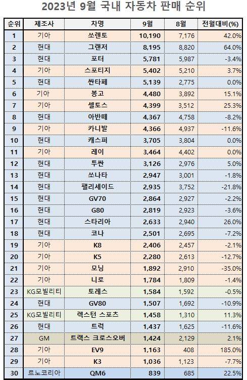 9월 국내 판매 1위는 쏘렌토(10,190대)가 차지했다. 뒤를 이어 그랜저, 포터, 스포티지, 싼타페가 판매되었으며 풀모델체인지된 싼타페는 출시 이후 기존 모델보다 2배 가까이 판매가 증가했다. 기아 EV9은 1,163대가 판매되며 전기차로는 유일하게 30위권 안에 위치했다.