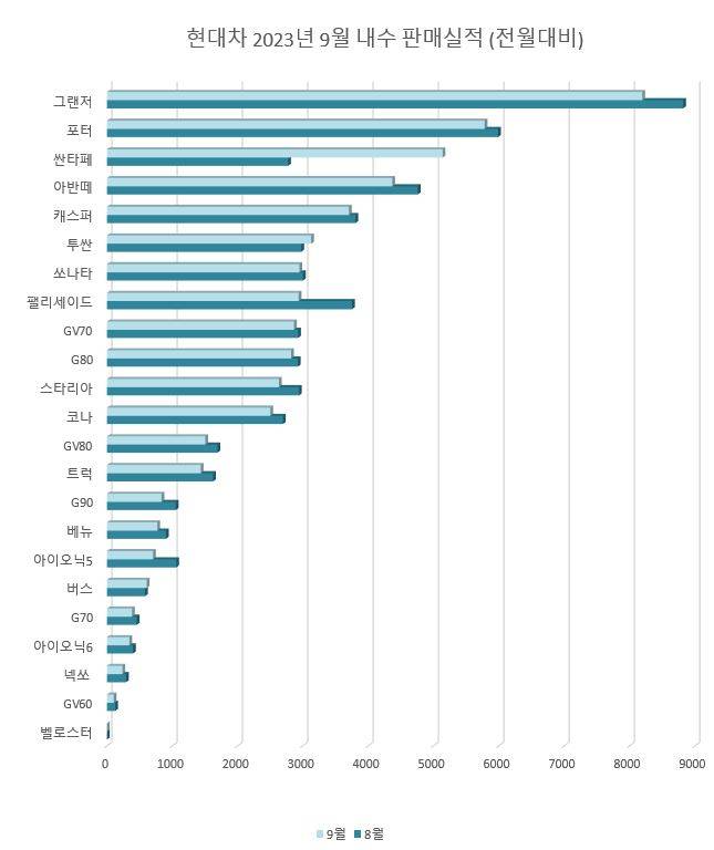 현대차는 2023년 9월 국내 시장에서 전년 동월 대비 5.3% 감소한 5만 3,911대를 판매했으며, 9월 해외 시장에서 전년 동월보다 0.9% 증가한 30만 3,240대를 판매했다.