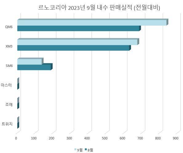 르노코리아의 내수 판매 실적은 지난 4월부터 5개월 간 이어진 하락세를 멈추고 반등했다. 9월 내수 시장에서 중형 SUV QM6는 총 839대 중 LPe 538대, QUEST(퀘스트) 119대 등 LPG 모델들이 657대 판매되며 78% 이상의 비중을 차지했다. 르노코리아의 9월 수출은 XM3(수출명 르노 아르카나)가 하이브리드 4,805대를 포함한 6,466대, QM6(수출명 르노 꼴레오스)는 940대가 각각 선적됐다.